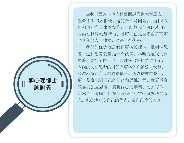最后,在“和心理博士聊聊天”的环节,对那些相比交际、更喜欢独处的孩子给予肯定和鼓励,告诉他们独立是一种优势,要积极发现自己的优势。