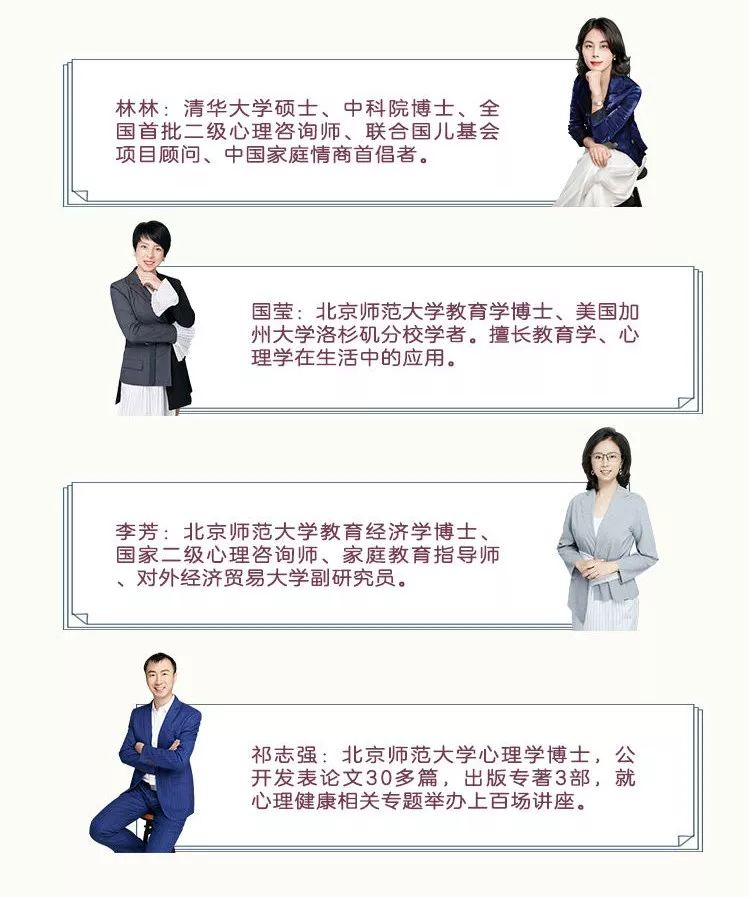 这个团队里,聚集了一群专注儿童心理教育的专业人士,中科院博士、清华大学教育学博士、北京师范大学教育学博士……全是最权威的心理学、教育学专家!