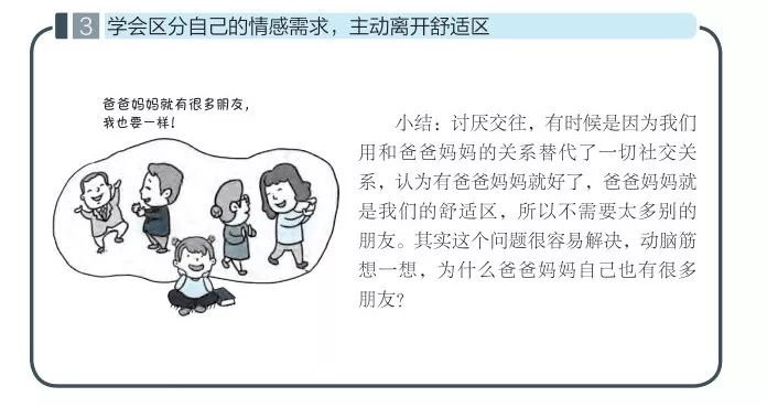 然后从心理学层面分步骤教会孩子如何解决不愿与人相处的问题: