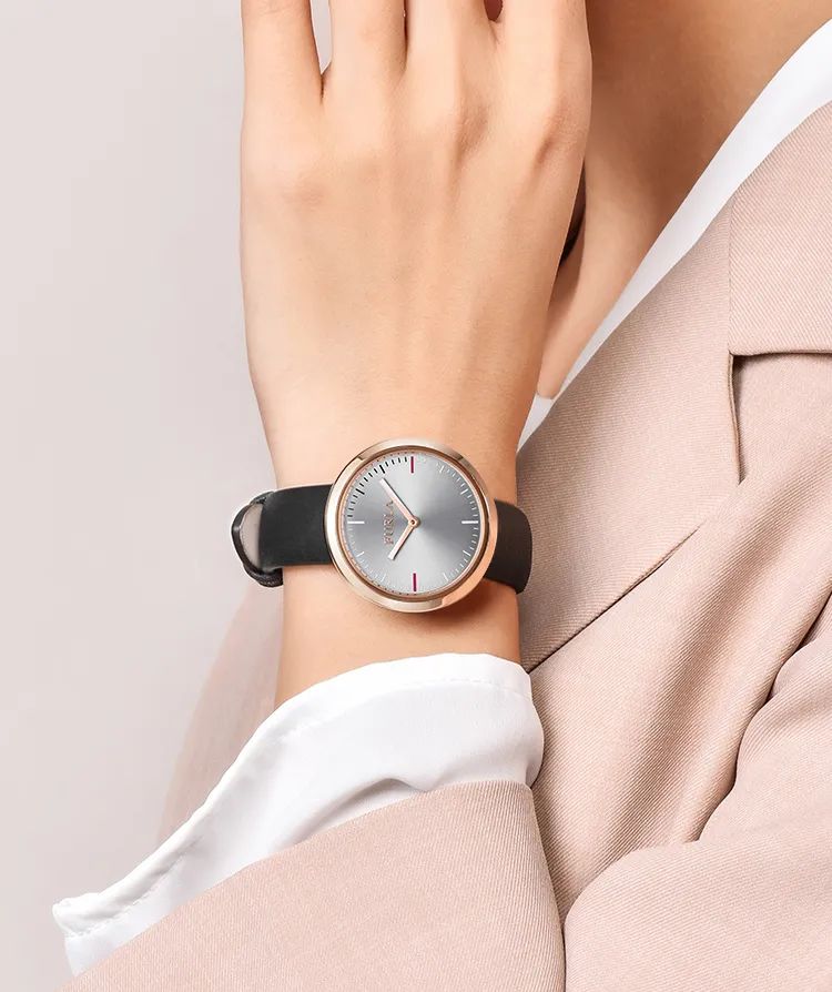 细牛皮表显得女人味十足,与活泼的圆形表盘相配,在少女的青涩与熟女的典雅间找到一个很好的平衡点。