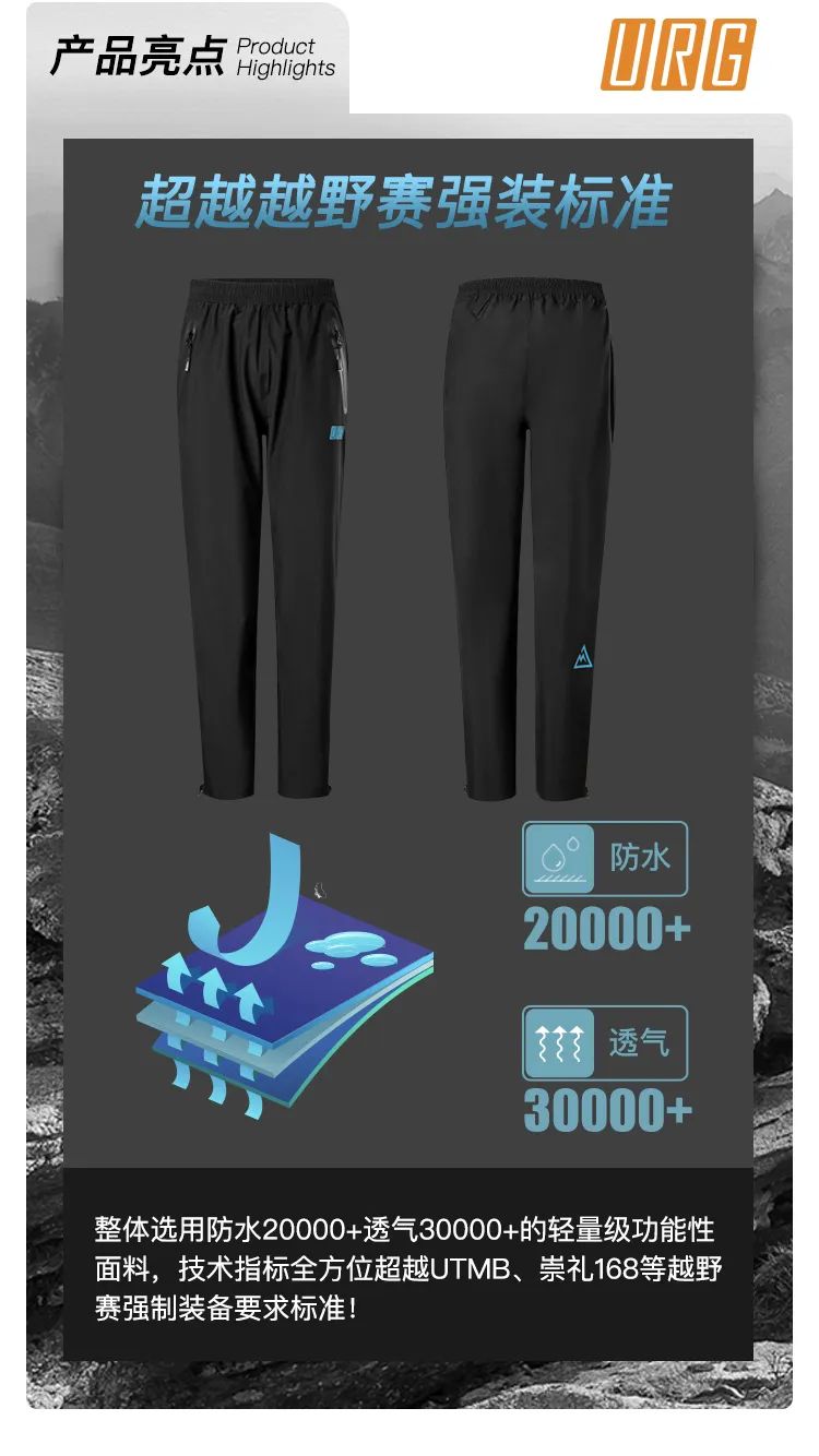 URG品牌首次推出全侧开越野冲锋裤,专为越野跑打造,可于狂暴风雨环境下持久穿着,保持身体干爽!