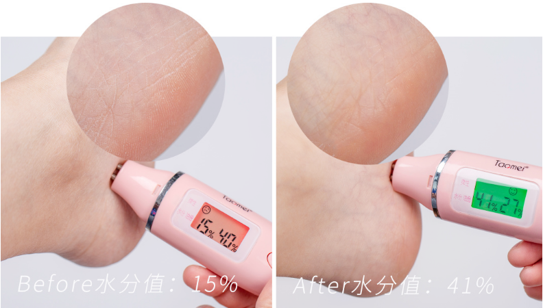 我们专门做了一个小测试:同事的足跟初始水分值是15%;涂完它,水分值有所提升,补水保湿效果可见。