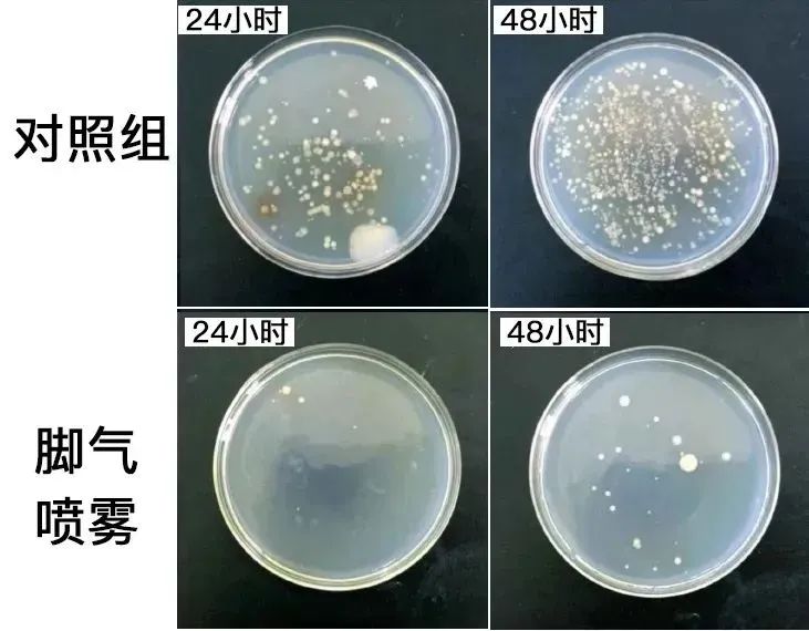 抑均效果到底有多强?研究人员专门用喷雾做了实验,48小时后,对照组已被细均占领。而喷了脚气喷雾的培养皿,只有零星几个细均!