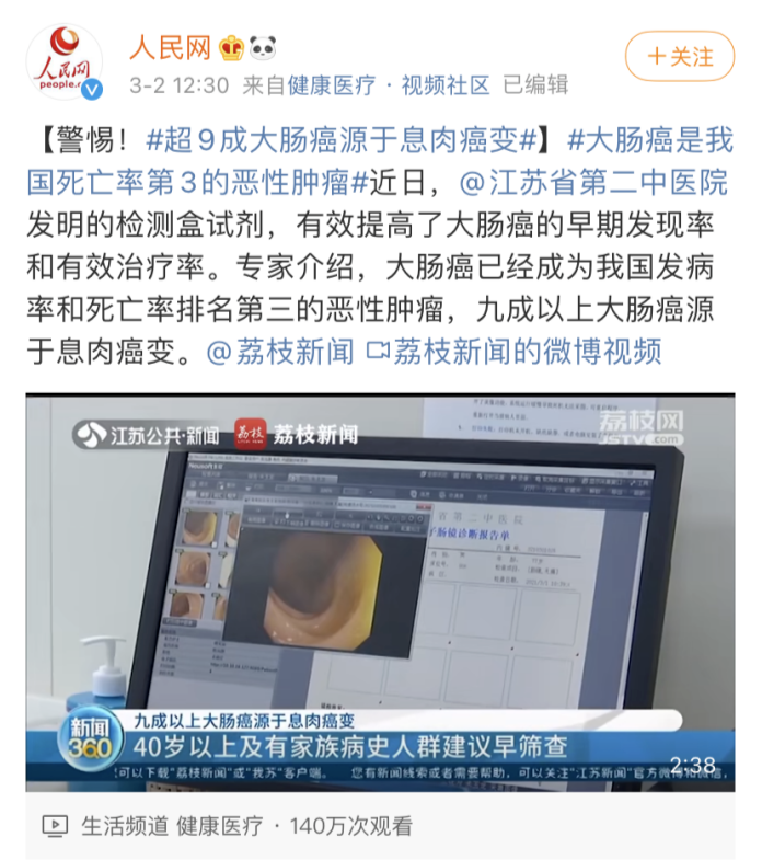 前不久一条#超9成大肠癌源于息肉癌变#的消息更是再次登上微博热搜,人民网发博称,“近日,由江苏省第二中医院发明的试剂检测盒,有效提高了大肠癌的早期发现率和有效治疗率。专家介绍,大肠癌已经成为我国发病率和死亡率排名第三的恶性肿瘤,九成以上大肠癌源于息肉癌变。”