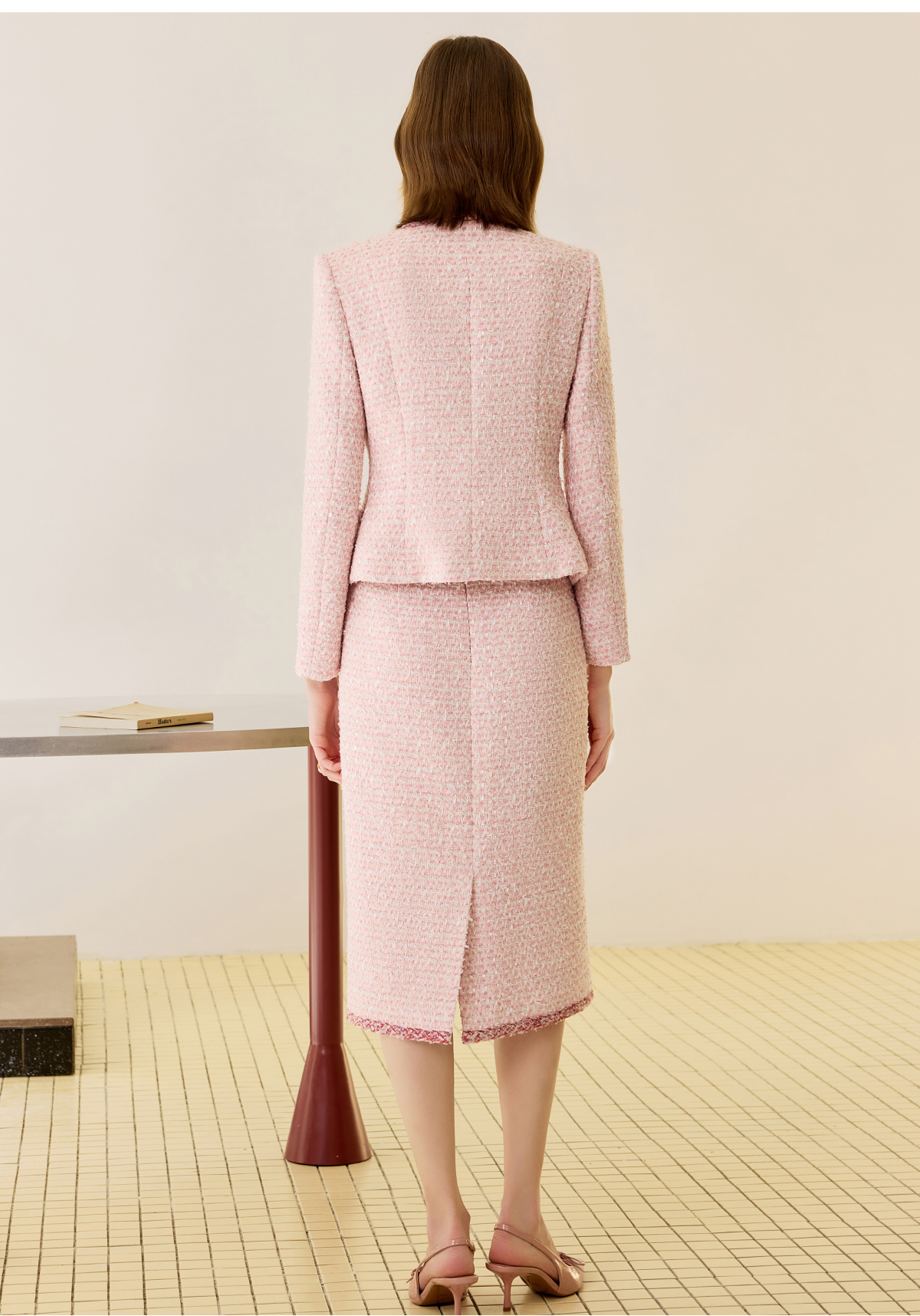 这抹粉调粗花呢,是把‘温柔有力量’穿在了身上~