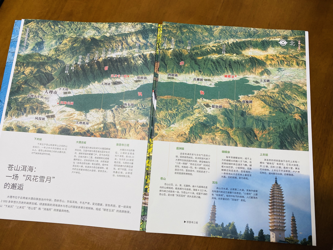 还有这张色彩饱满,一目了然的苍山洱海地势图。这一页是拉页,可以拉开展示哦。