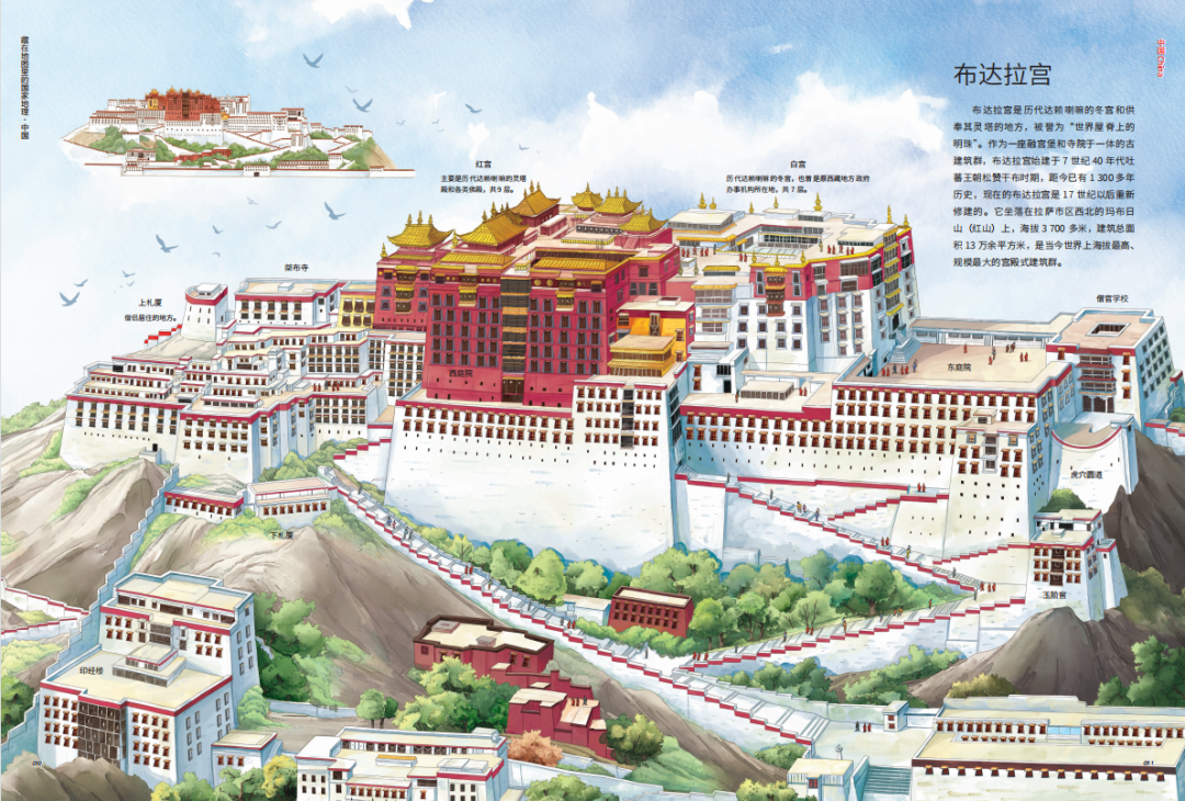斥“巨资”邀请插画大师手绘的布达拉宫图。建筑细节、尺寸比例都是经过业内专家严格审定的哦。