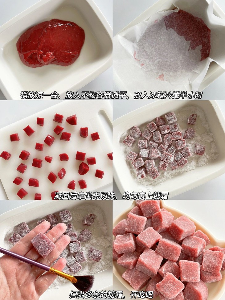 ❹凝固后拿出来切块,均匀裹上糖霜,扫出多余的糖霜,开吃吧