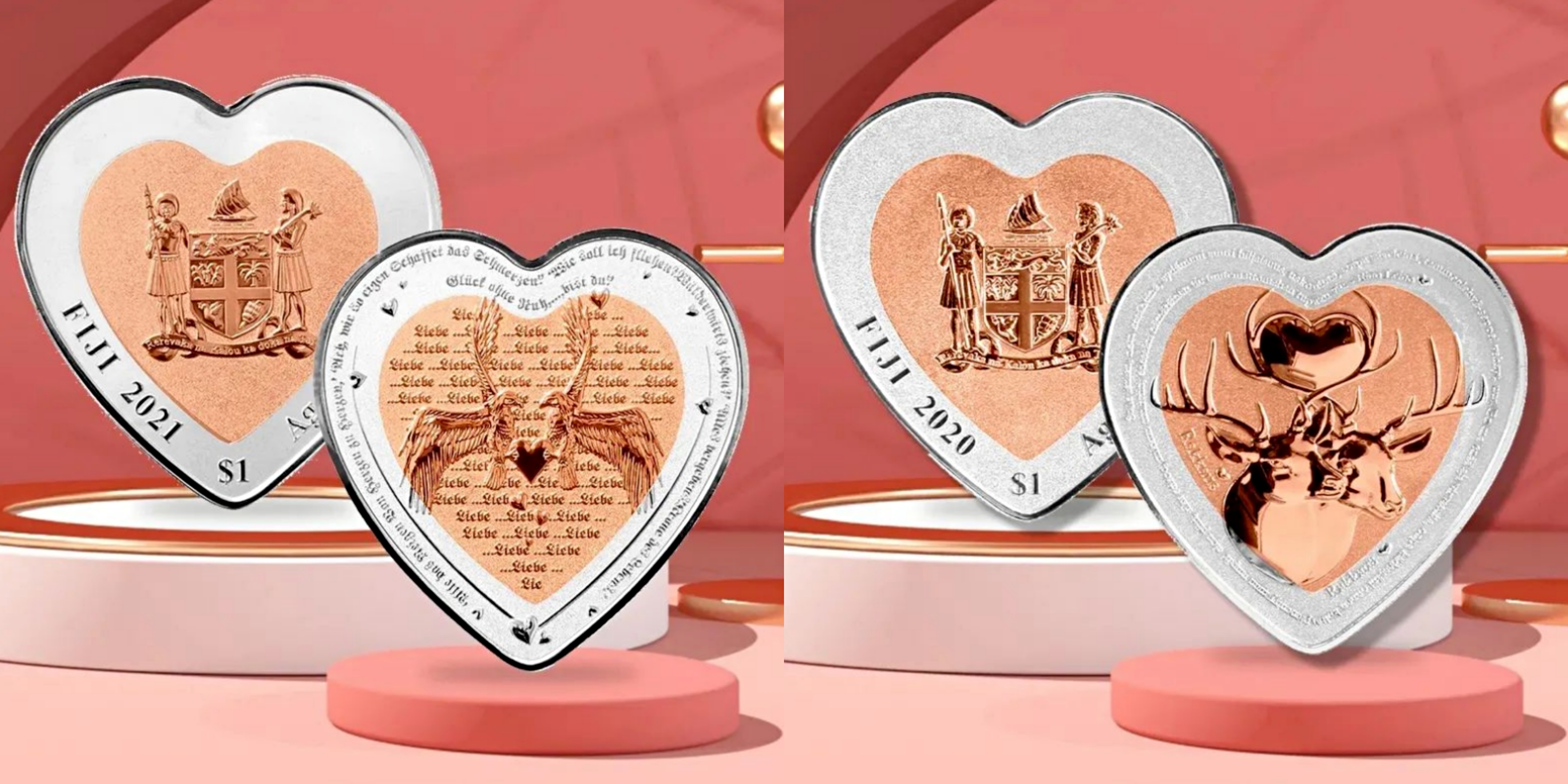 2019年,浪漫的鼻祖——斐济共和国,发行了以“爱情颂歌”为系列的心形双金属精制纪念银币。