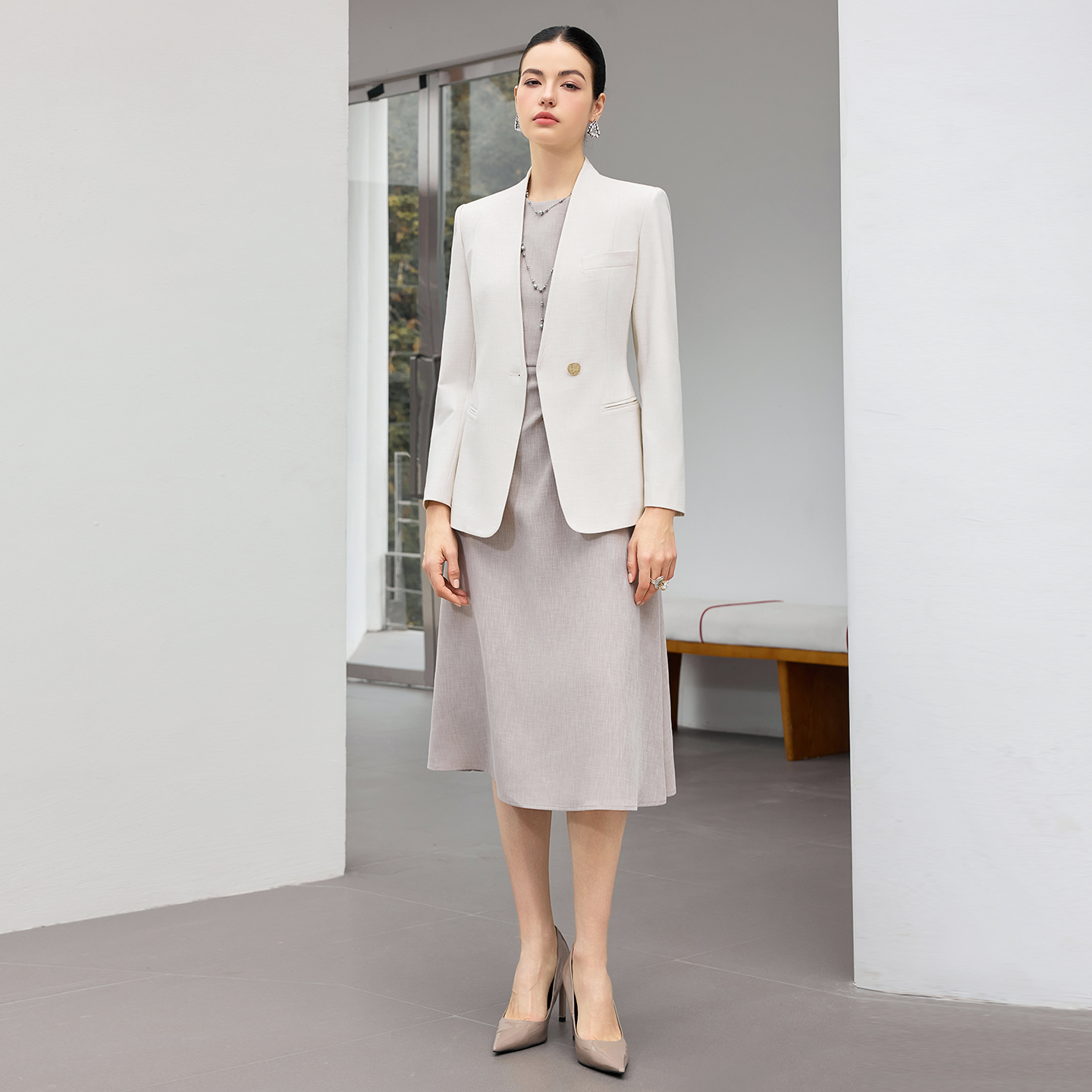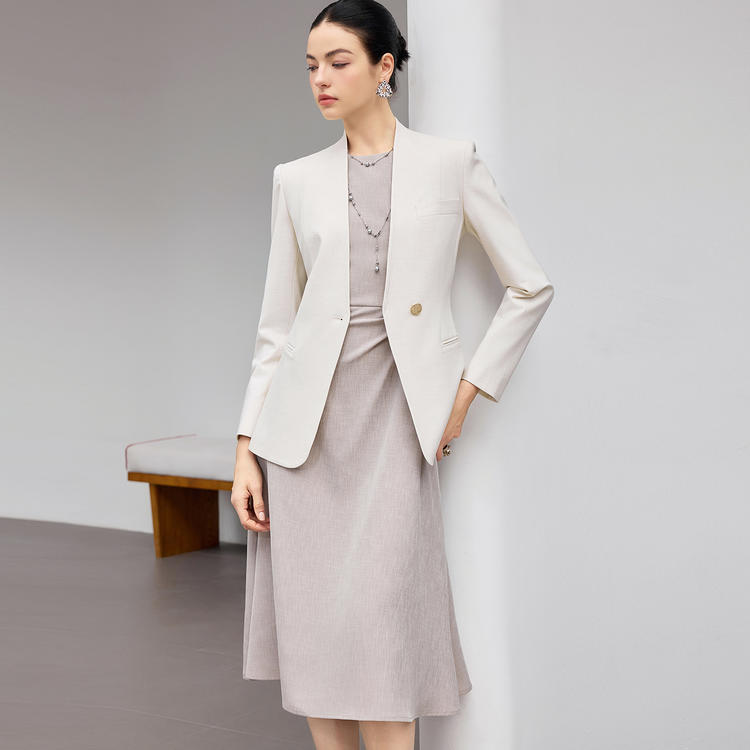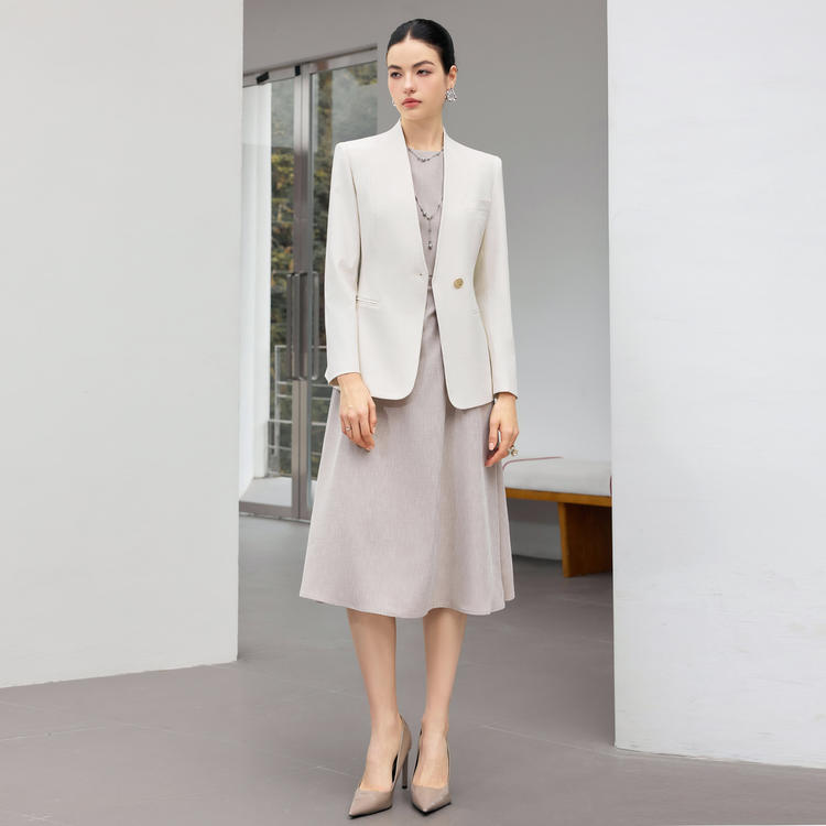内搭连衣裙,裙长及膝,线条流畅,既符合职场着装的端庄规范,又能在举手投足间流露优雅气质