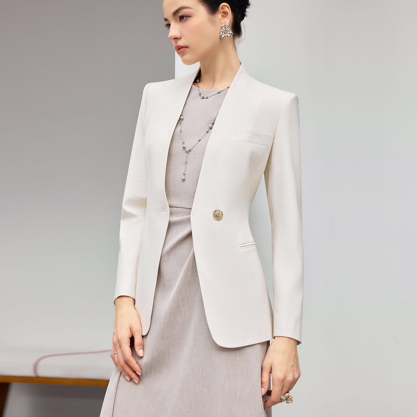 以低饱和度的米白与浅灰为主调,视觉上干净高级,既不会过于张扬,又能在人群中凸显专业气场。