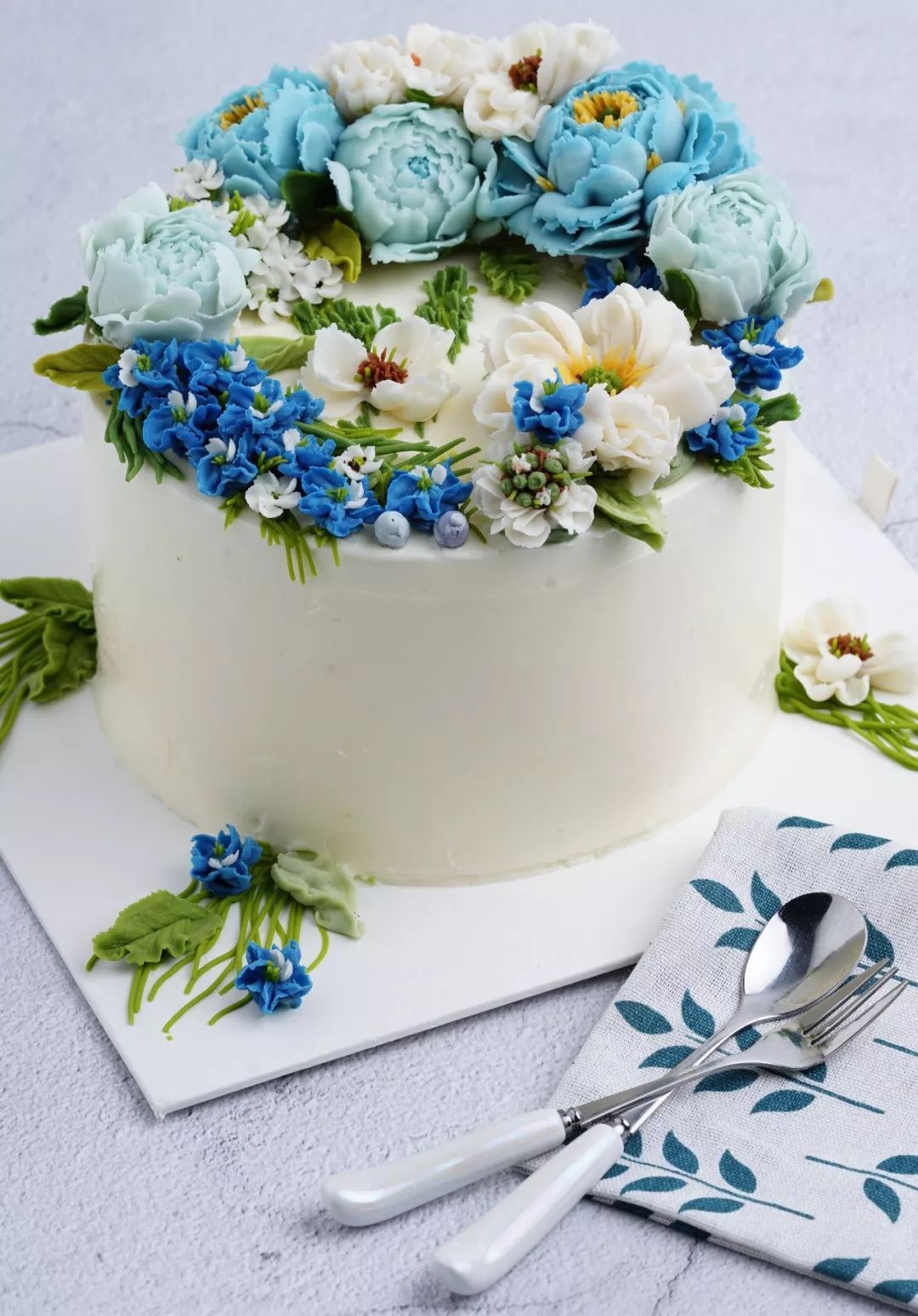 蛋糕胚涂上浓浓的纯白奶油,仿佛一张洁白的画纸等待画家恣意地挥洒。