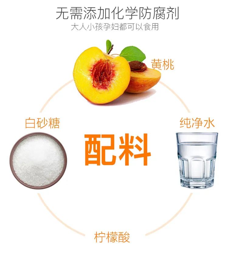 选用当季新鲜黄桃,全程6小时锁鲜,通过265项农残检测,和新鲜水果一样营养放心。