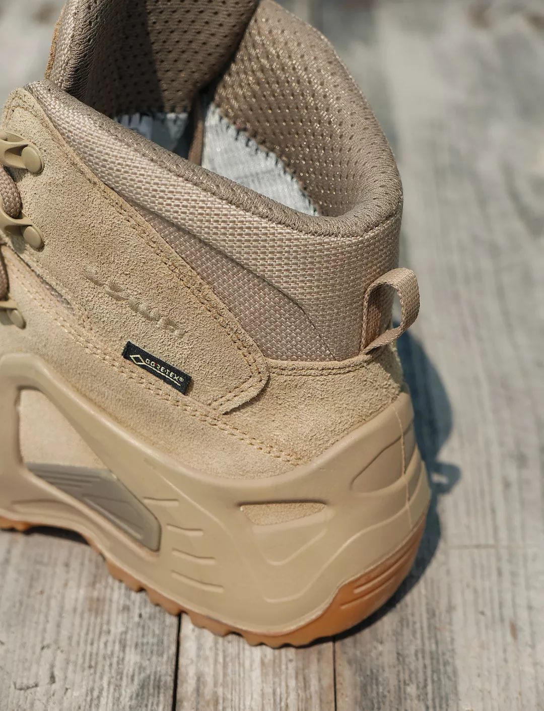LOWA这款ZEPHYR军靴配备Gore-Tex®防水透气内衬,Gore-Tex®内衬简单来说就是一层能够挡住风、雨、雪灌入鞋内的薄膜面料。
