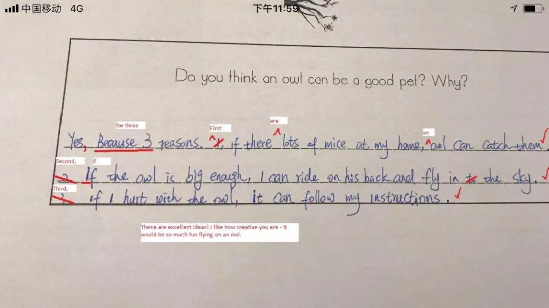 加之作业本身内容也非常有趣,不教条,非常符合小孩爱幻想的天性。所以小孩很乐意去做作业并且每次做完作业后就会迫不及待的询问这次我的作业会不会是fantastic 或creative呀,我会得几个五角星呀。