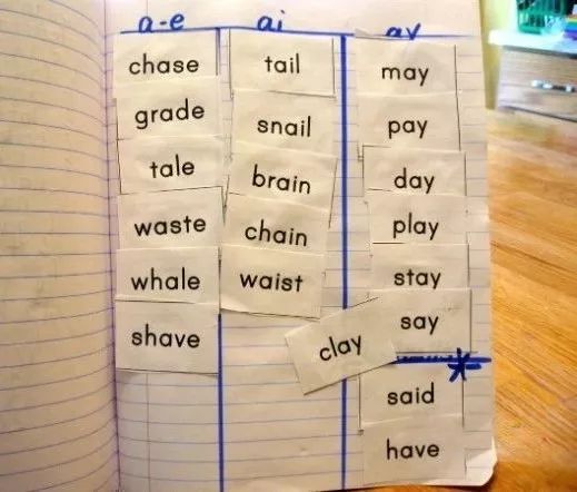 听起来好像很难操作,但是其实通过自然拼读,可以很简单地实践这个方法。比如,很有效的一个方法是单词分类,像上图一样,让孩子自己将带有相同元音、辅音的单词归类到一起,可以帮助孩子识别拼写的规则,而不只是机械性的记忆。