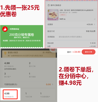 3.分享给朋友下单:A.可以分享25元优惠卷给朋友,B.下单后1份赚4.98元!