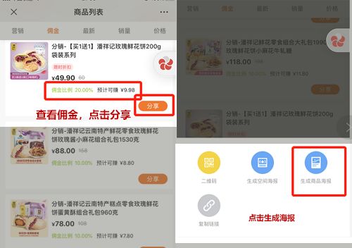 方法:进入分销中心——点击推广商品——进入到商品列表(可以查看佣金例如:分享成交能得到9.98元佣金)——分享——生成海报——成交后返回个人分销中心查看佣金!