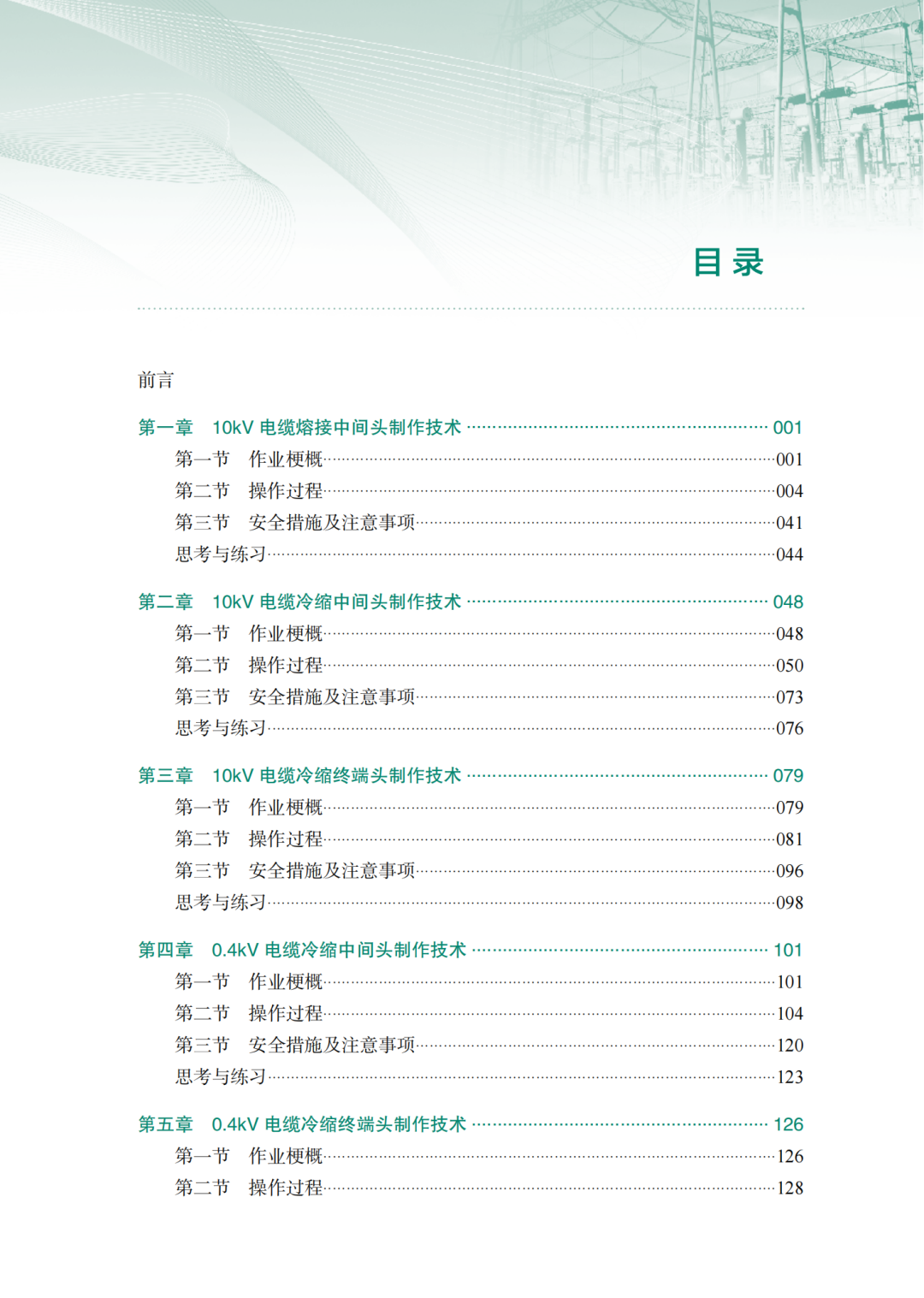 本书主要内容包括10kV电缆熔接中间头制作技术、10kV电缆冷缩中间头制作技术、10kV电缆冷缩终端头制作技术、0.4kV电缆冷缩中间头制作技术、0.4kV电缆冷缩终端头制作技术、10kV电缆故障测试技术、10kV电缆路径查找技术、10kV电缆识别技术、10kV电缆超低频介损测试技术、10kV电缆振荡波局放测试技术十章,每一章包括作业梗概、操作过程、安全措施及注意事项三小节内容及相应的思考与练习,以细化的理论知识和实操标准,帮助配电电缆作业人员标准化、规范化开展业务工作。