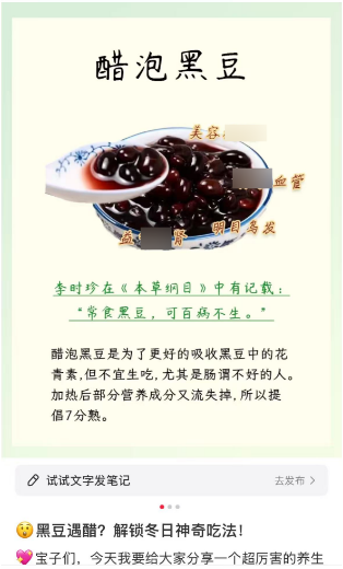《五十二病方》其中就有关于醋豆的记载:“黑豆煮醋,滋胃肾,小便癃闭。”直到现在各大社交平台上也有很多人分享、点赞。