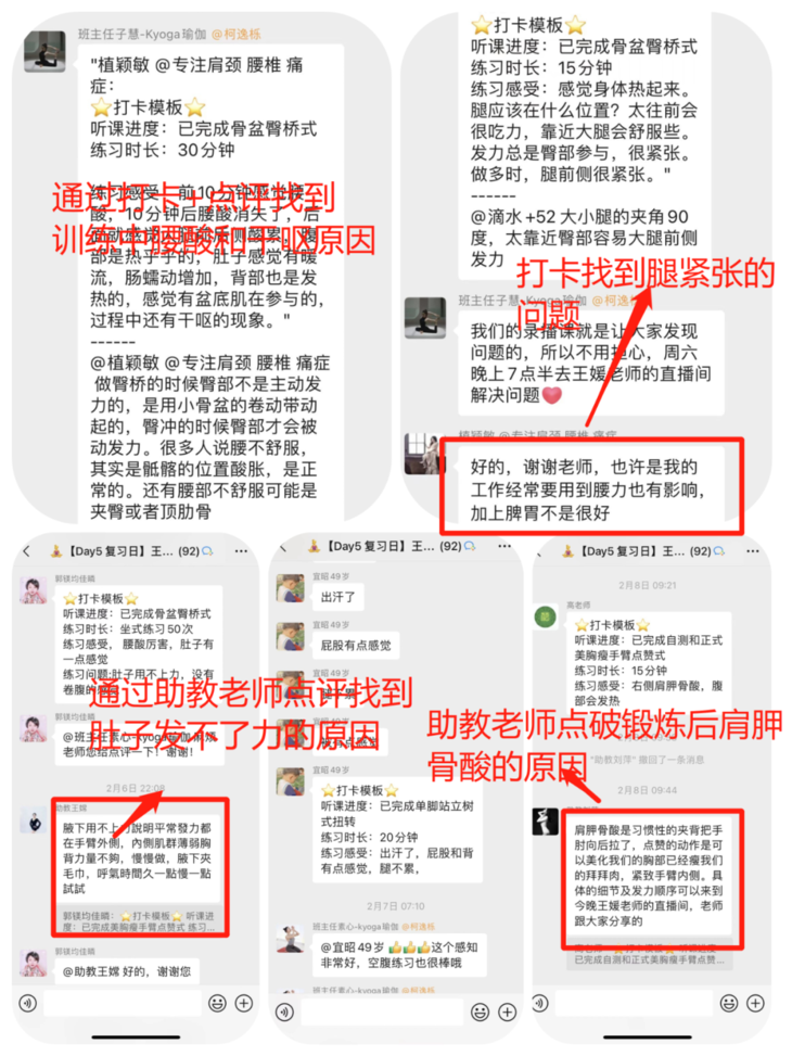 王媛老师不仅自己真人直播带练,还组建了专业的班主任团队,让每个学员的难题都能被关注到,真正学到对自己有用的瑜伽训练。