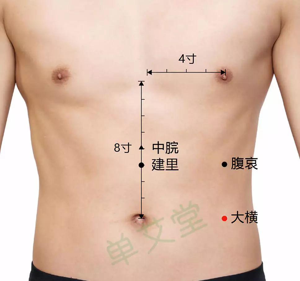 大横穴在腹中部,距脐中4寸。(此穴为双穴,左右各一)