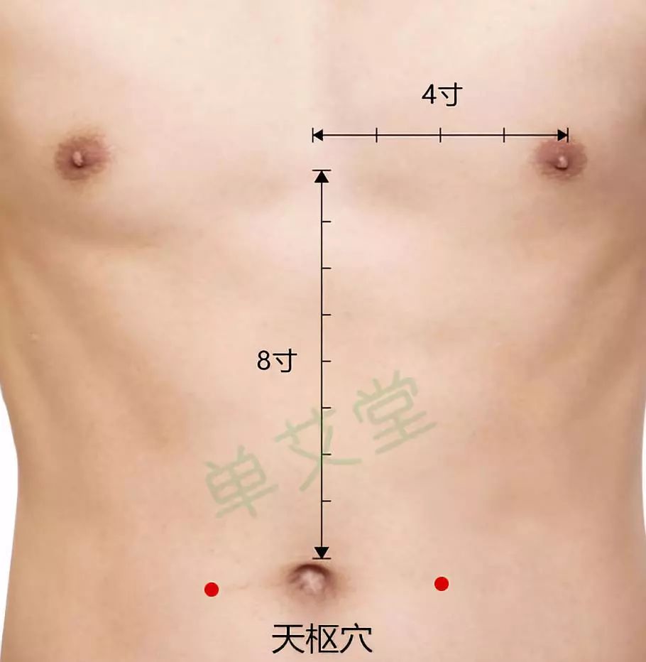 天枢穴在腹中部,距脐中2寸。(此穴为双穴,左右各一)