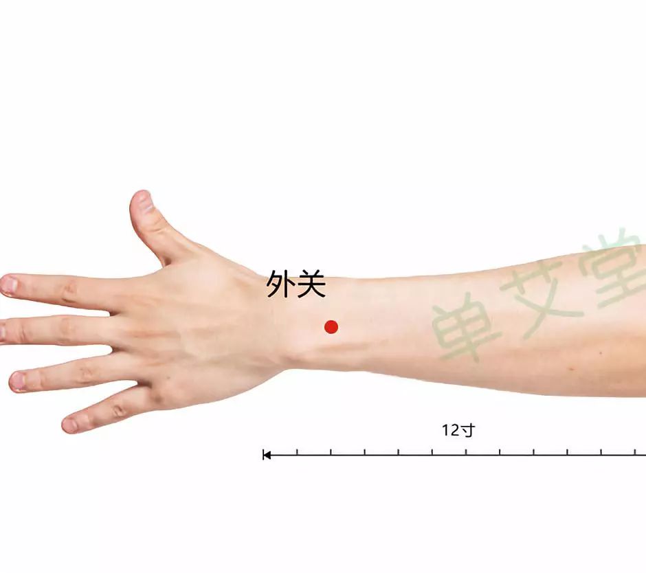 外关穴在前臂背侧,当阳池与肘尖的连线上,腕背横纹上2寸,尺骨与桡骨之间。(此穴为双穴,左右各一)