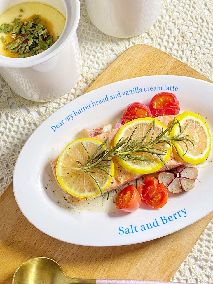 3、把迷迭香放在三文鱼底部,蒜头、小番茄对半 切开,摆入盘中,然后淋少许橄榄油,放上柠檬 片。