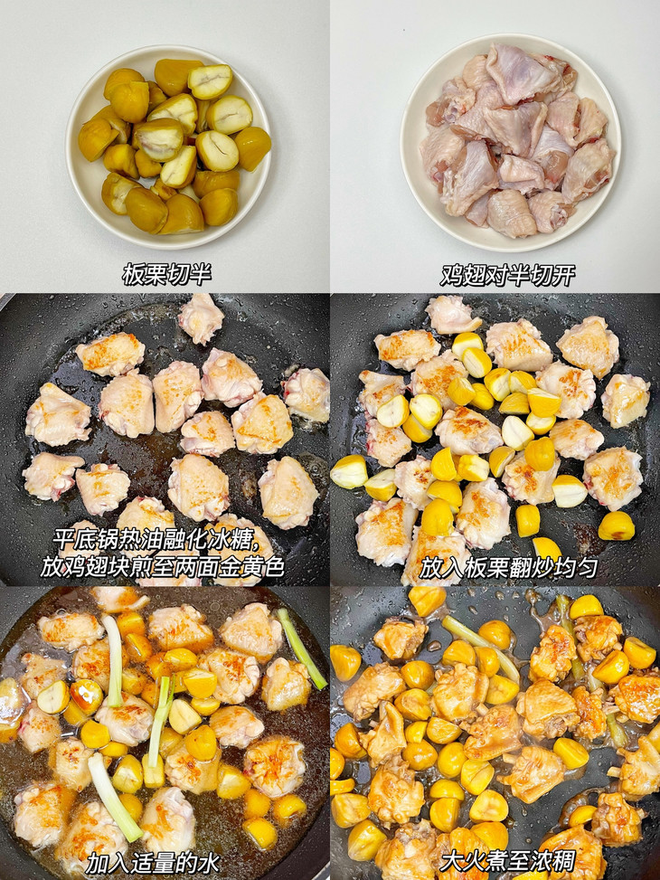 ❷板栗切半,鸡翅对半切开。平底锅热油融化冰糖,放鸡翅块煎至两面金黄色