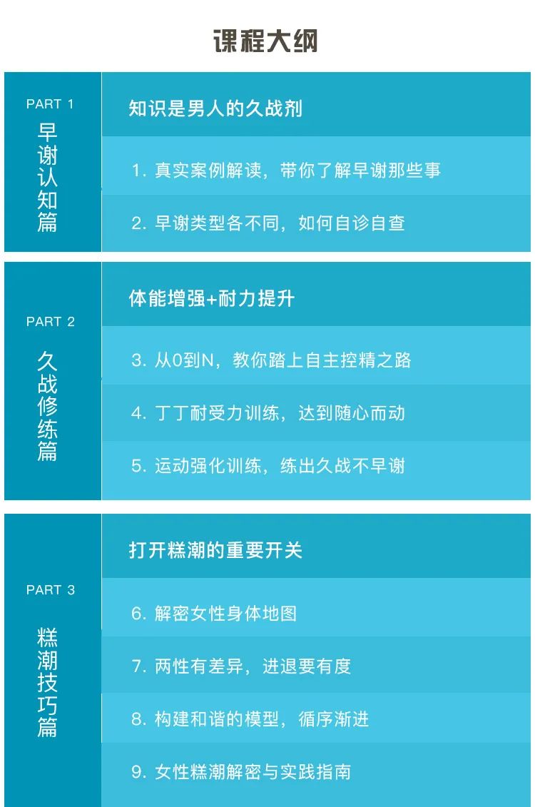 《久战9攻略》视频课,把她7年男性科普教育的精华都记录了下来。我推荐给所有想要缓解时间焦虑、和伴侣享受更高质量生活的男士。