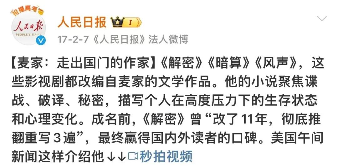 央视力荐、入选《人民日报》书单,《华尔街日报》甚至一个月内连续报道了三次麦家的作品……