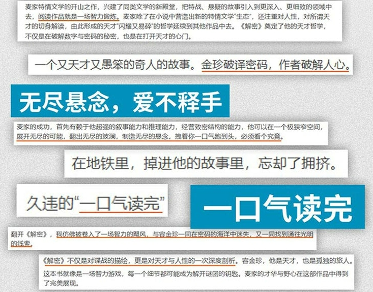 用著名小说家倪匡的话来说就是:“早知道麦家的小说好看,但不知道好看到了这种程度。”