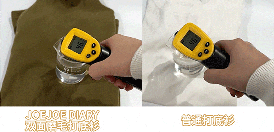 在同等室温的情况下,然后分别用我们的双面磨毛打底衫和普通打底衫包裹一杯46℃的开水:
