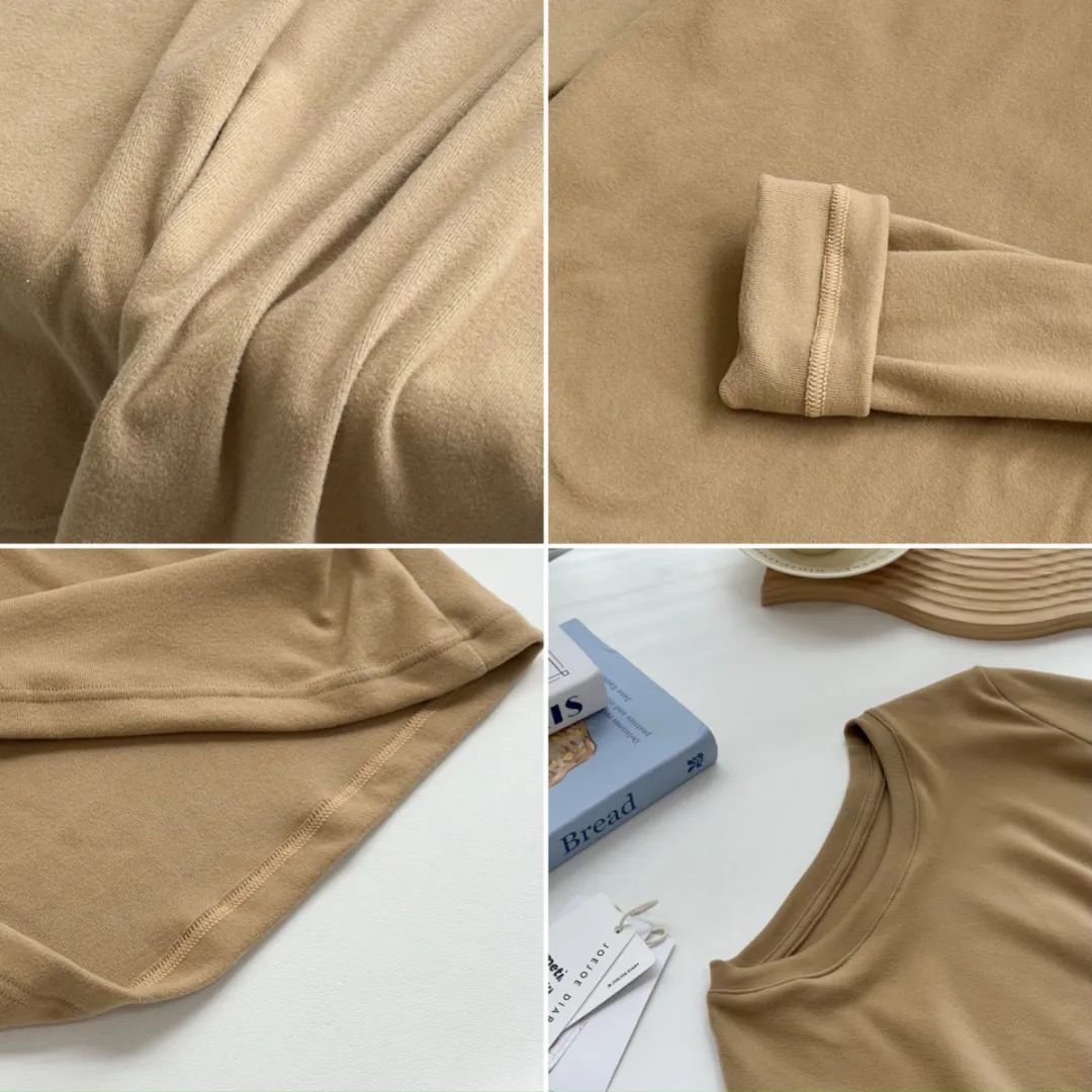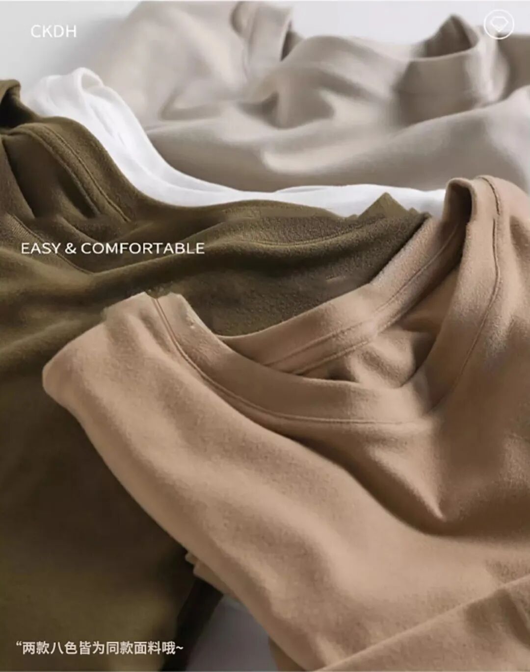 咱们今天强推的这款双面磨毛打底衫主打「松而有型、紧而有量」的H版型。