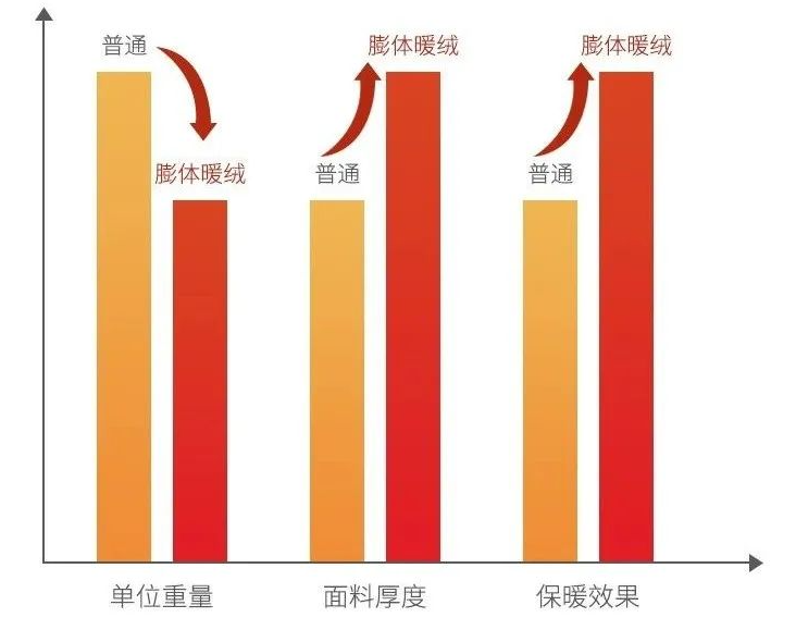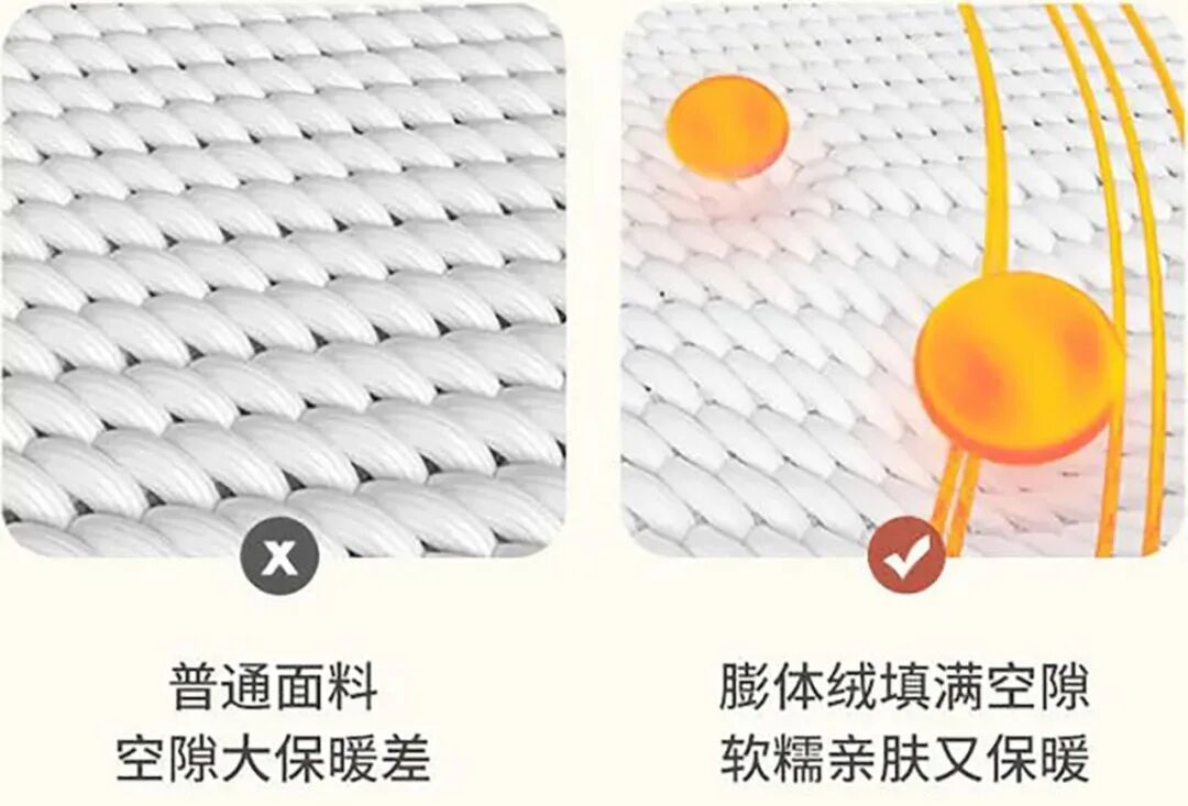 注意咯~“蓬松度”就是它保暖发热的关键点,因为织物纤维蓬松度越高,面料便能固定更大体积的空气层,保温隔热会更好。