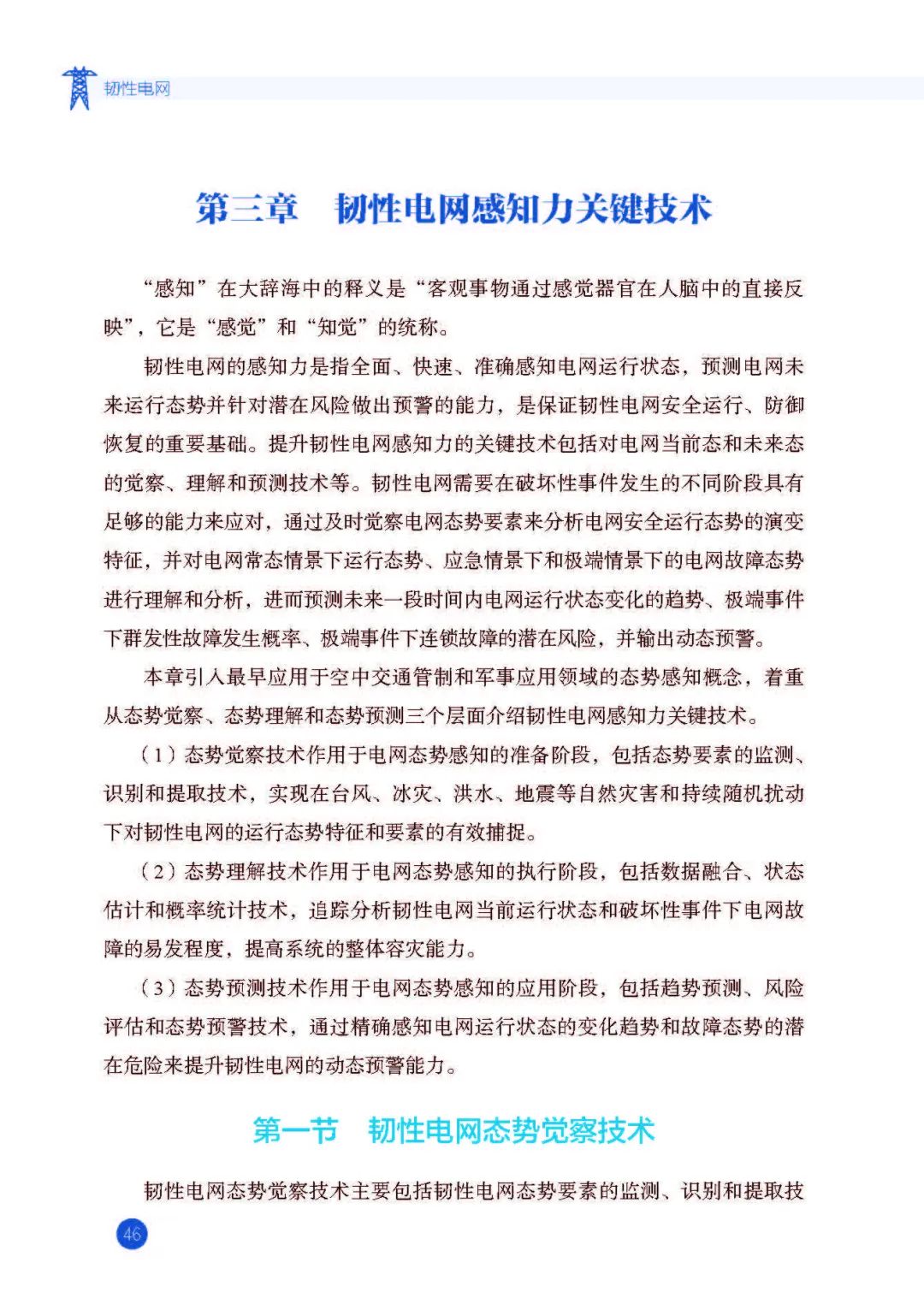 1. 感知力:全面、快速、准确感知电网运行状态,预测电网未来运行态势并针对潜在风险作出预警的能力。