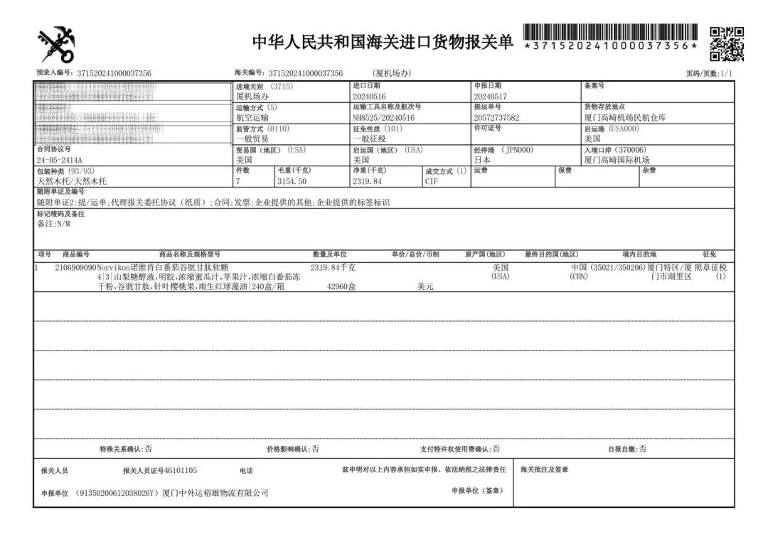 正儿八经美国进口,报关单在这呢▼