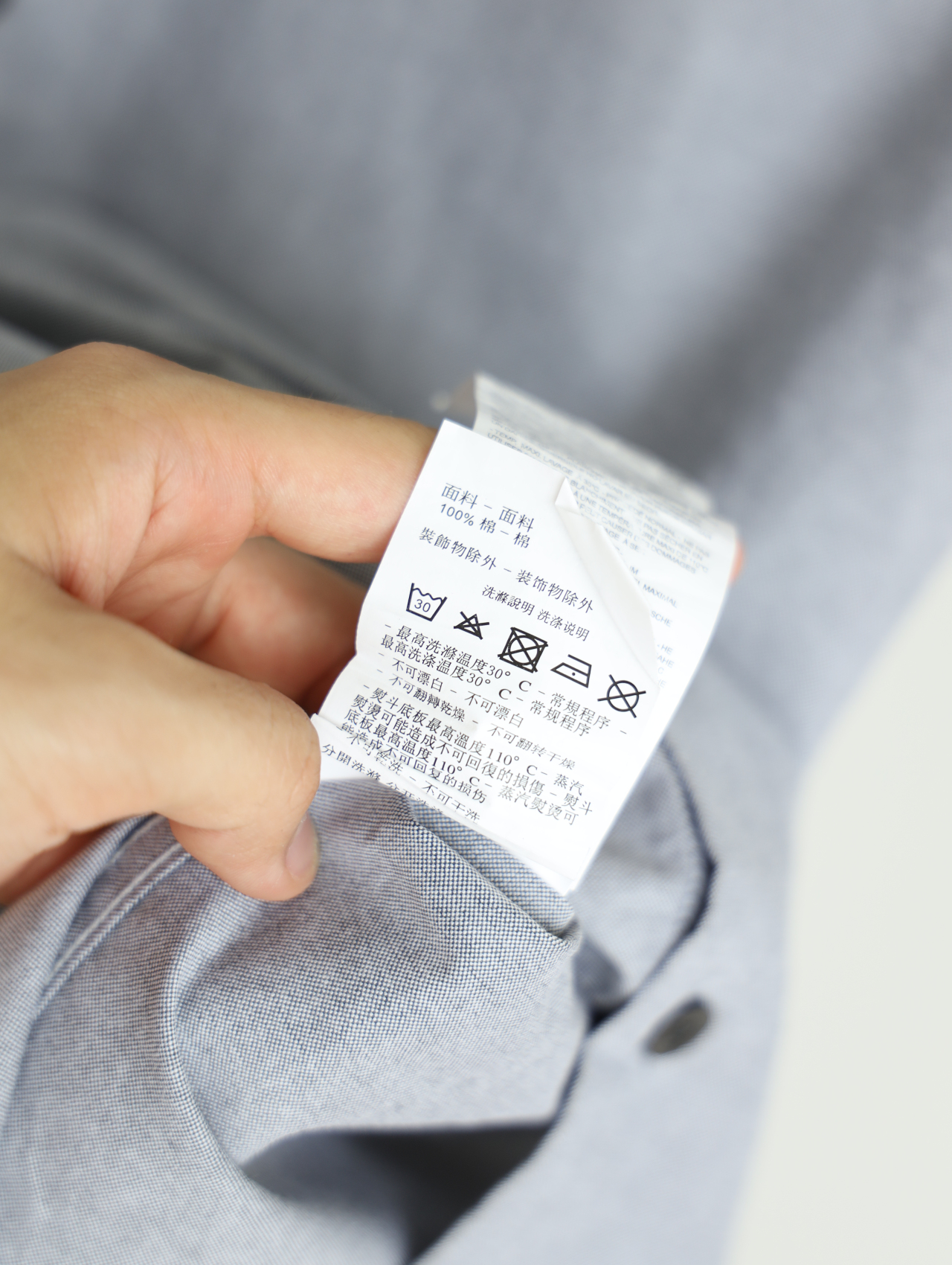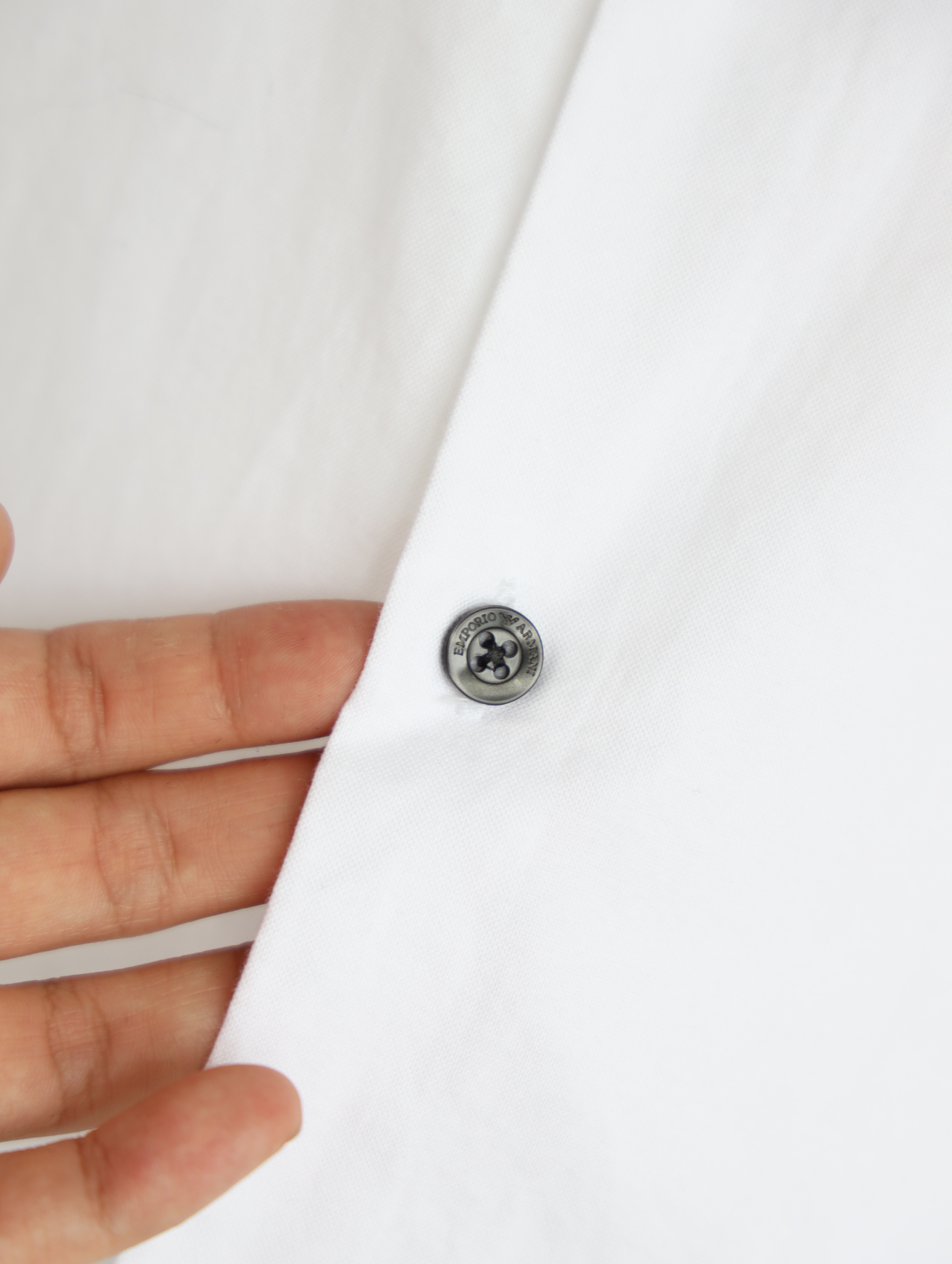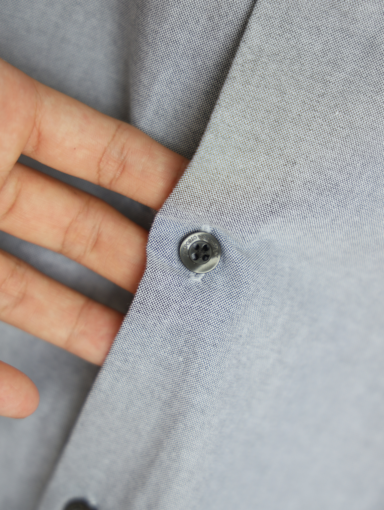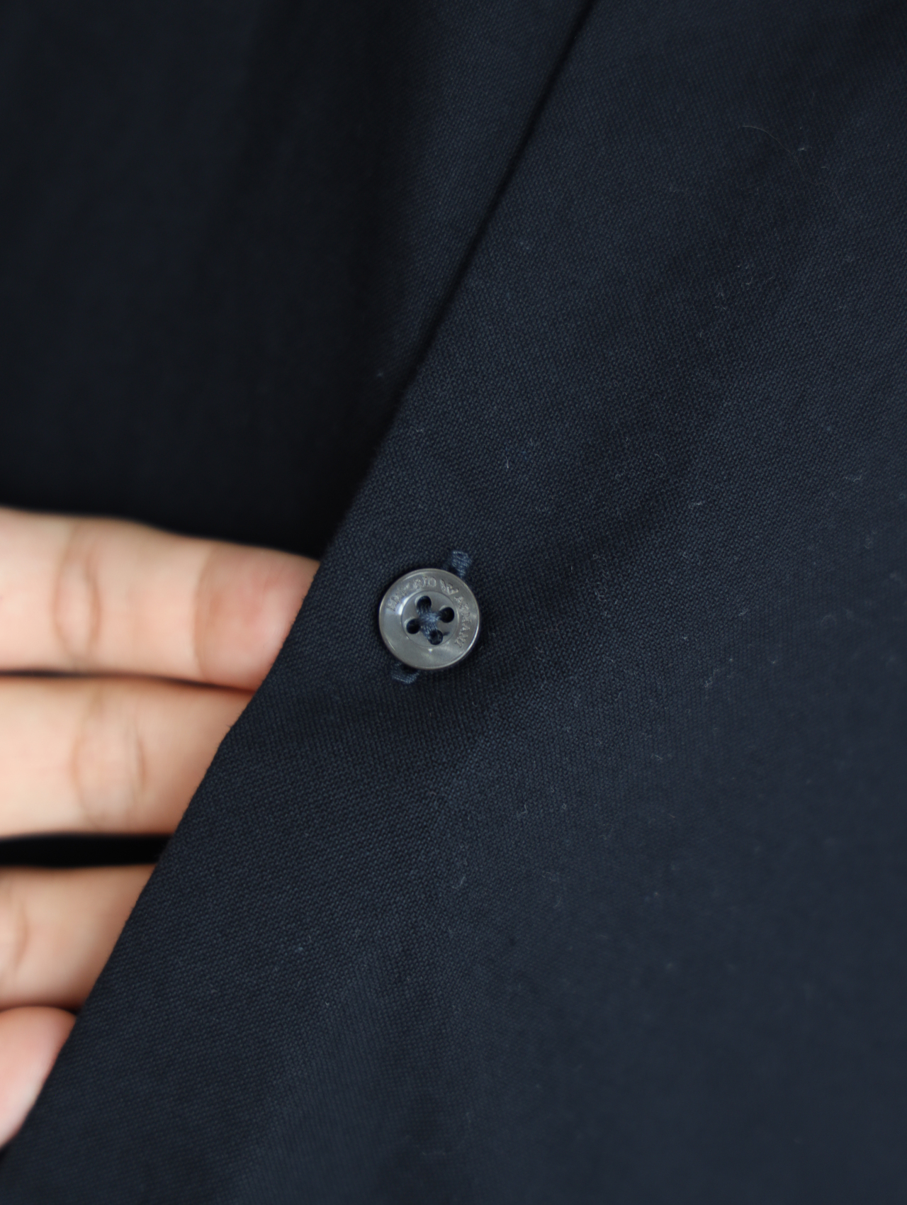 纽扣带LOGO字母雕刻,100%棉,成衣水洗,带一点收腰的slim修身版型,上身更显精神
