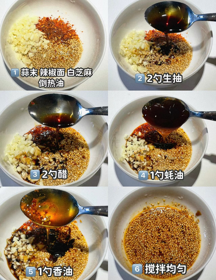 2、倒入秘制酱料:蒜末、辣椒面、白芝麻,倒热油!十2勺生抽、2勺醋、1勺蚝油、1勺香油,搅拌均匀即可~