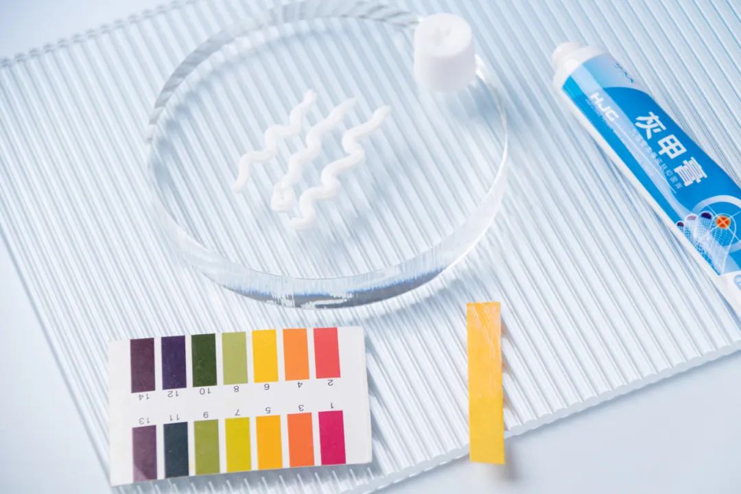 我们还进行了PH测试,PH数值为5-6呈弱酸性,接近人体的酸碱环境,直接涂在指甲缝里也很安心。