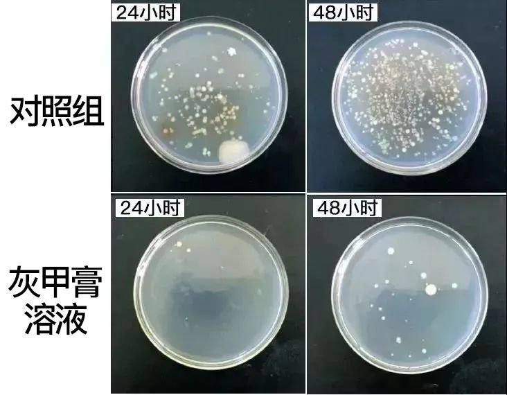 在真菌培养皿里面倒入这款灰甲膏溶液,分别查看24H、48H,对照组已被菌落占领,而倒入灰甲膏溶液的培养皿,只有零星几点菌体。