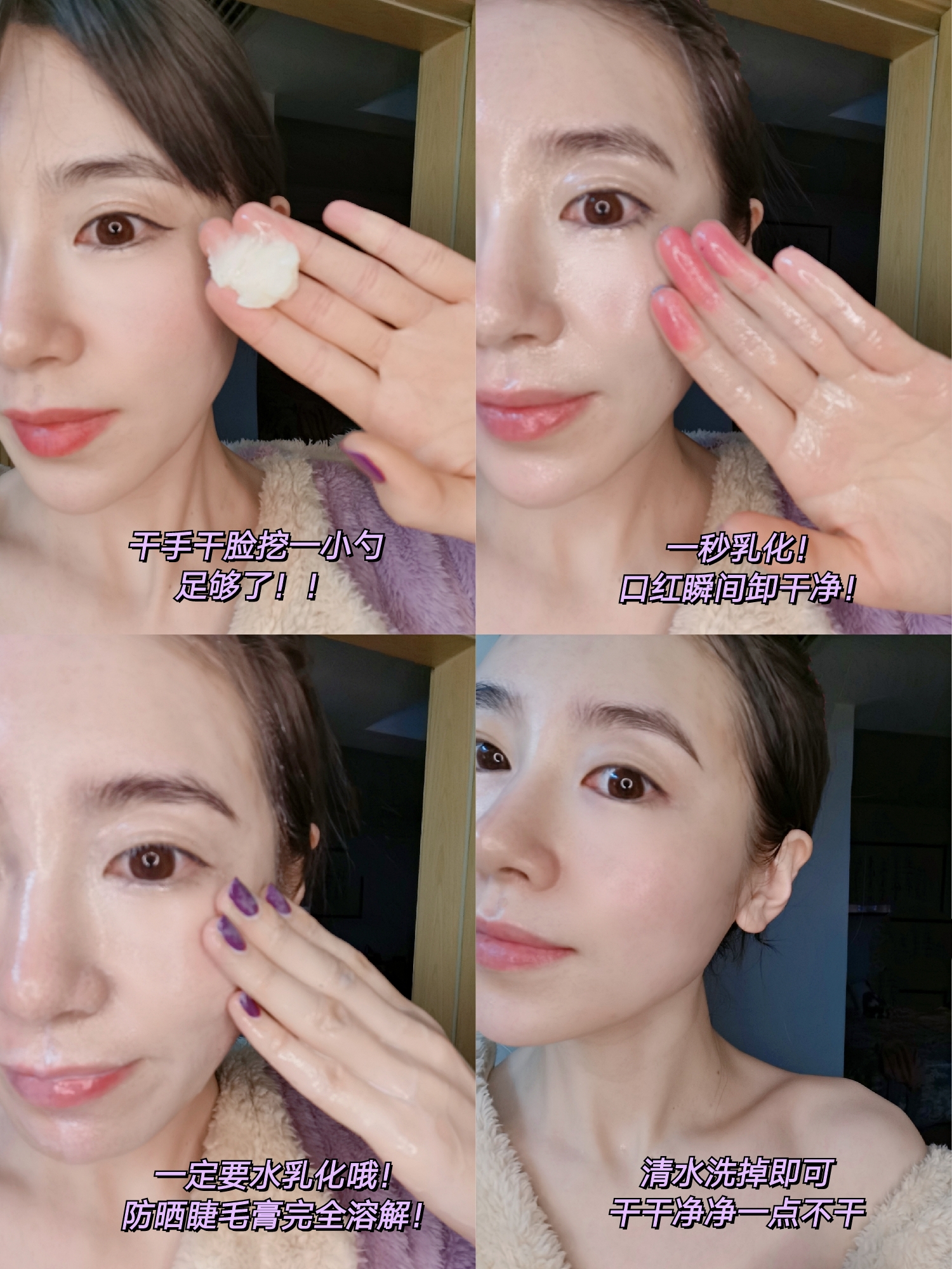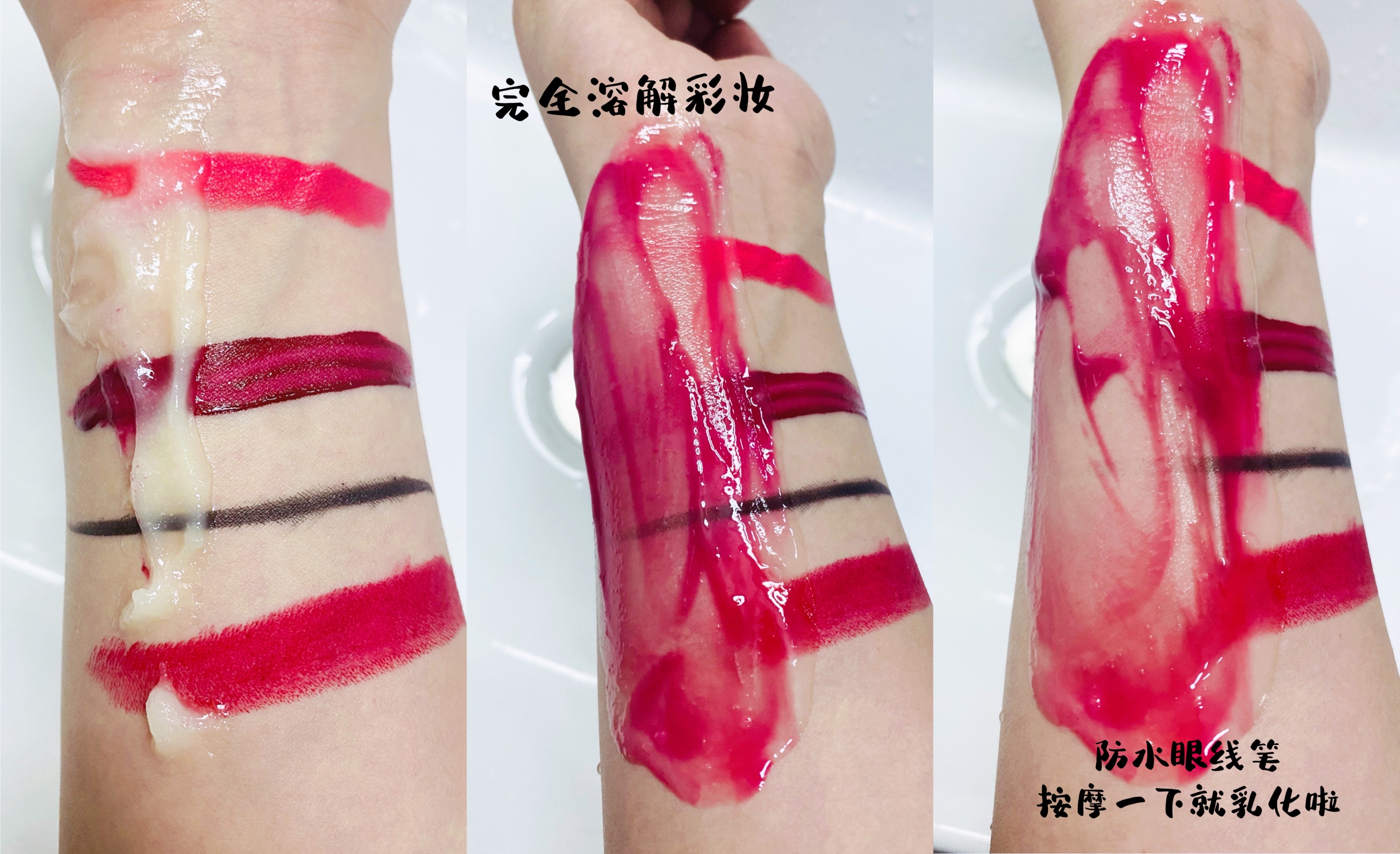 很多人会担心用卸妆油洗完彩妆后,脸上会有油脂残留,油油的不舒服,这主要是考验产品的乳化和冲洗难易度,基于此,我们特地做了一个小测试。