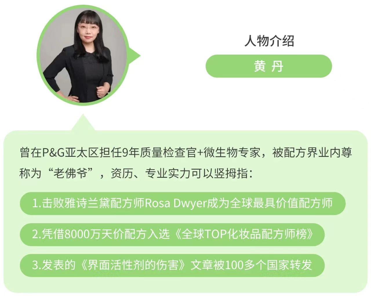 黄丹专注于配方领域,深耕功效。她曾超越了雅诗兰黛配方师,荣登全球配方师收入排行榜top1️⃣,“全球最具价值配方师”易主为中国!(此处应该有掌声~~)