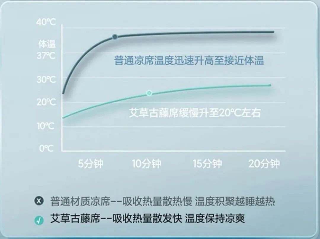 把艾草精华直接融入到了藤条里再编制成席,这样既没有熏艾那种难闻的味道了,也不需要额外再去买艾草回来。