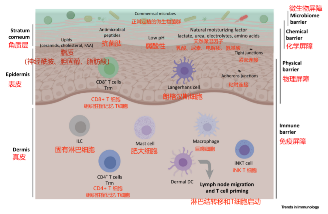 今天的主题是【皮肤的微生态】,我们曾经讲过微生态属于皮肤的四大屏障之一。皮肤一共有多少个屏障呢?我找到了一幅非常形象的图发给大家。