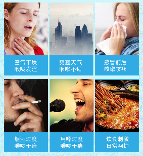 适应人群:咽喉痒人群、咽痛人群、教师、户外工作、吸烟人群、糖尿病人等