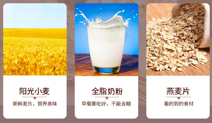 1.真材实料:精选麦片、玉米、大豆等谷物粗粮,营养均衡又美味,身体更棒!