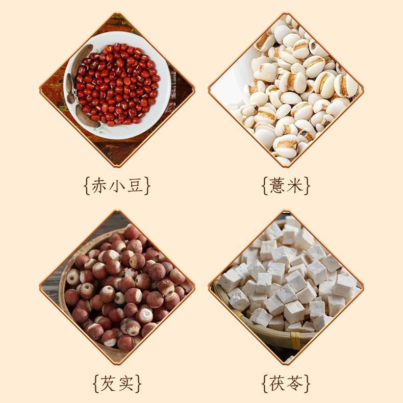 优选了 4 味药食同源的食材:赤小豆、薏苡仁、茯苓、芡实,每一味都是精挑细选,君臣配伍,科学搭配!