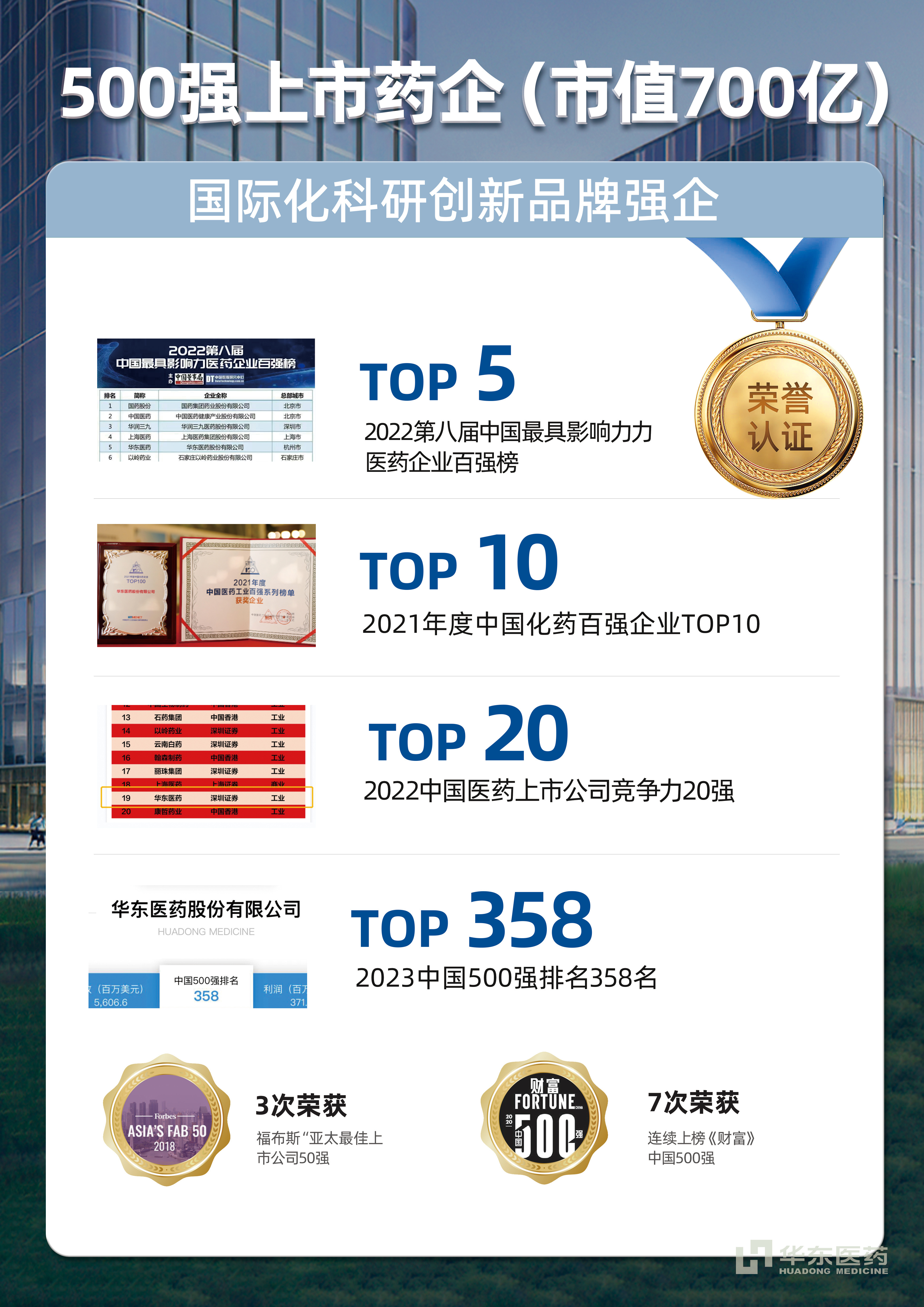连续13次上榜《财富》坐拥700亿市值稳居中国化药企业 TOP10荣膺中国 500 强大型综合性医药上市公司